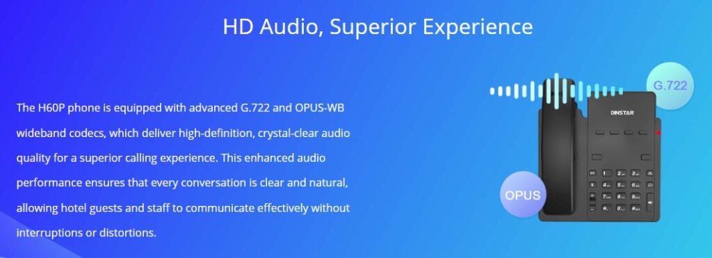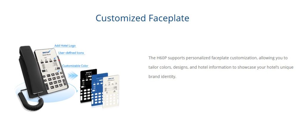 The H60P Hotel Phone is a cost-effective HD audio IP phone designed for the hospitality industry. Easy to operate and compatible with various IP voice systems, it adapts to diverse hotel needs. Featuring PoE to reduce wiring costs, the H60P includes 6 programmable keys for hotel service hotlines. With a customizable faceplate and seamless integration with IPPBX, it offers call features like speed dial, call waiting, and voicemail, enhancing service quality and customer satisfaction.