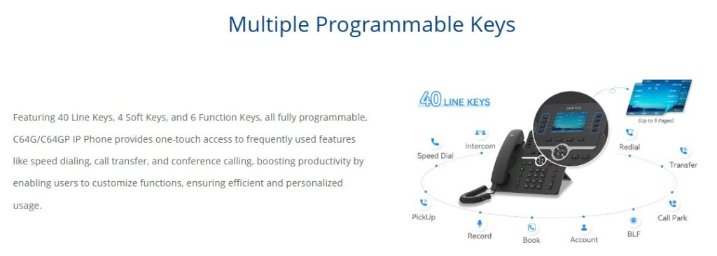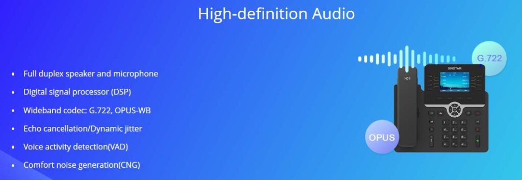 The Dinstar C64G/GP is a high-end HD IP Phone designed for business use. With its elegant appearance and outstanding performance, it is suitable for various environments. The 3.5”320 x 480-pixel graphical LCD with backlight provides excellent visual clarity. The phone offers superior HD voice quality and a range of system functions to meet diverse user needs. Featuring dual Gigabit Ethernet ports, the C64G/GP is easy to install, configure, and use. It supports 16 SIP accounts and 6-way conferencing, seamlessly integrating with IP PBX systems to deliver rich business functionality.